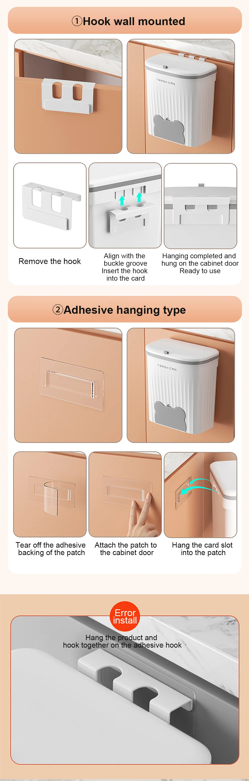 Hanging/ Wall-mounted/ Placed - The kitchen garbage can be installed in any place you find comfortable. You can hang the compost bin on kitchen cabinet doors (The thickness of the door should be less than 1in). Or you can use adhesive hooks or strips to stick it on a vertical surface. You can also just place it on a countertop.